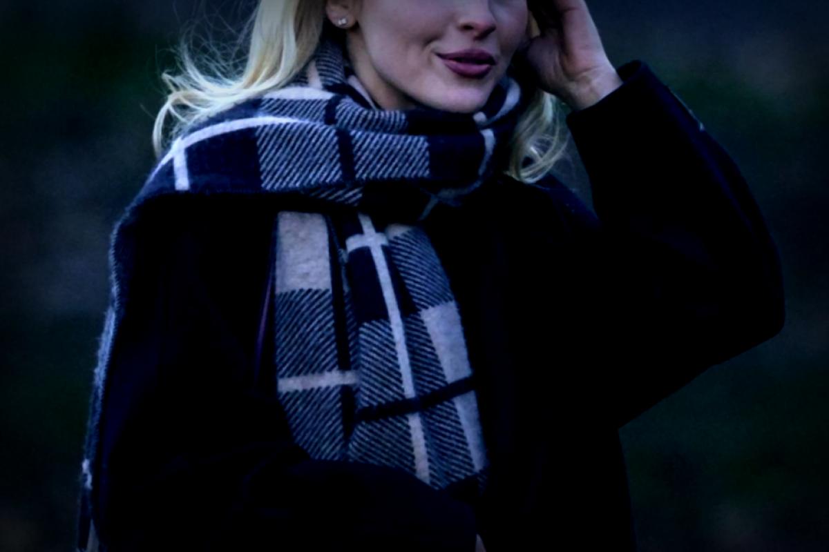 Taking a break from flashy corsets and killer heels, Sabrina opted for a picture-perfect oversized black coat that immediately caught fans’ attention. It’s none other than the famous Slouch Coat by Aritzia, which she first flaunted at Taylor Swift’s birthday bash back in December 2023. Paired with a trendy plaid scarf in a mix of beige, black, and gray, she definitely made a statement, especially since checked patterns were trending on major runways like Burberry and Maison Mihara Yasuhiro for Fall 2025.